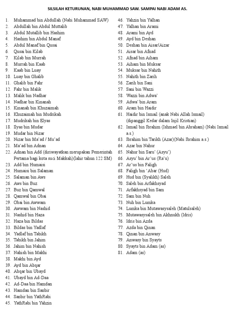 Bahkan pada periode tahun 70an telah dirilis sebuah film karya antory quin dengan judu the message. Silsilah nabi muhammad sampai ke nabi adam detailnya baca di kitab arrokhiiqul makhtum, tarikh ibnu hisyam dll.adi. Maulid nabi atau maulud adalah peringatan hari lahir nabi muhammad saw. Dimulai dari akar adalah manusia pertama, yaitu nabi adam (1). Pohon nabi adalah pohon silsilah para nabi mulai dari nabi adam hingga nabi muhammad.